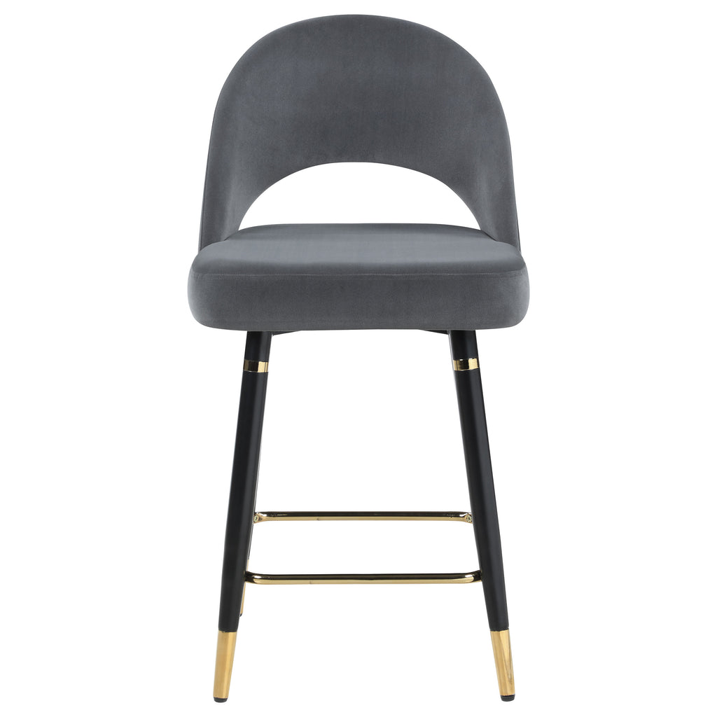This set of two counter height stools features an elegant bucket style seat that lends a retro-inspired Mid Century modern look. Each stool offers long-lasting, supportive seats for each guest, wrapped in faux leather upholstery that complements numerous color palettes and adds a bold statement piece. Flared, tapered legs further lend to the vintage flair. Gold capped feet and a supportive foot brace offer a dramatic, regal Hollywood glam touch. Pull these stools up to a spacious entertainment room bar for cocktails.