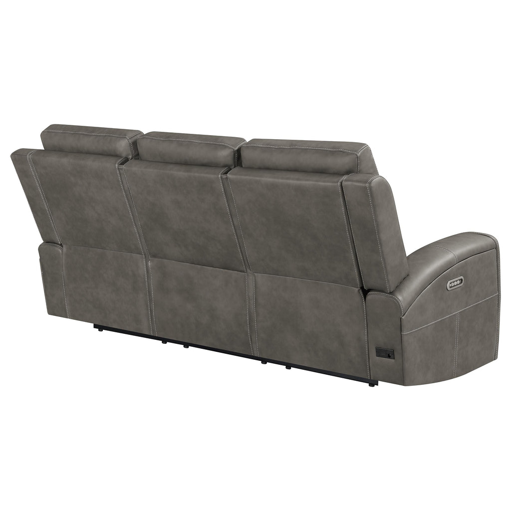 A sanctuary of comfort and thoughtful design, this triple power reclining sofa turns the everyday into something extraordinary. Upholstered in soft leatherette with contrast stitching, its sculpted silhouette offers both structure and serenity. Sink into deep, supportive cushions while power recline, headrest, and lumbar settings respond with effortless grace. A drop-down console reveals hidden storage and ambient LED lighting, while the sleek control panelÑcomplete with dual USB portsÑkeeps everything within reach. Even in moments of stillness, a rear power connection and emergency battery option ensure comfort never loses power.
