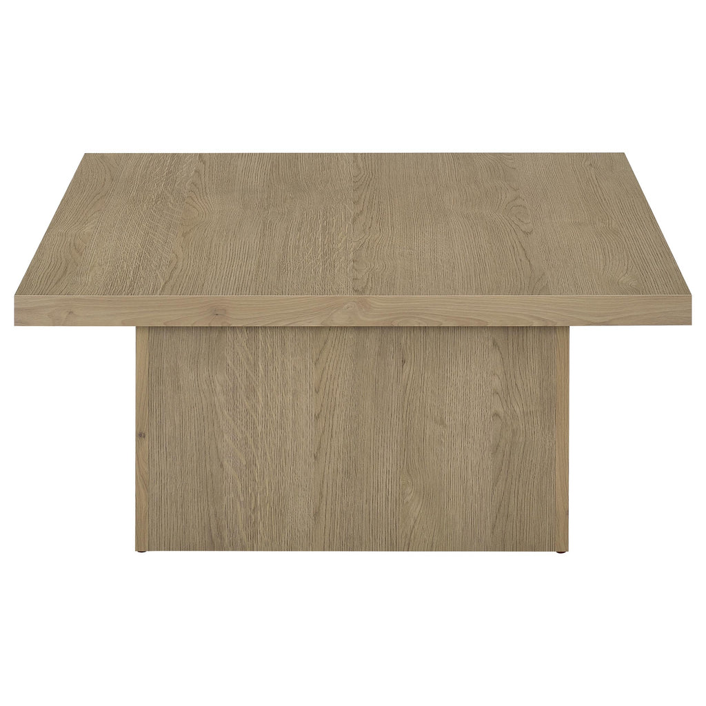 Square coffee table in latte brown offers bold shape and grounded modern styling