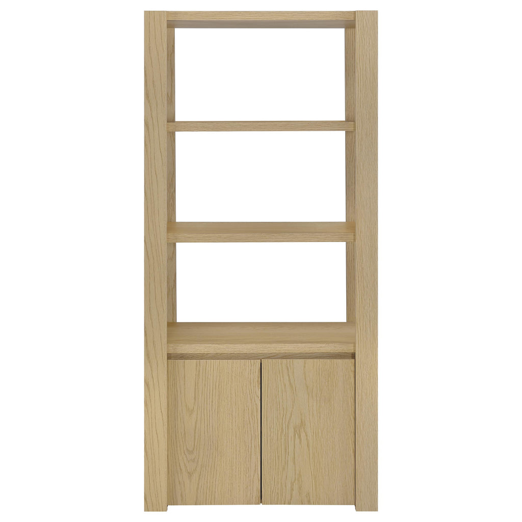 Media tower with open design and closed cabinet in a serene light oak woodgrain finish
