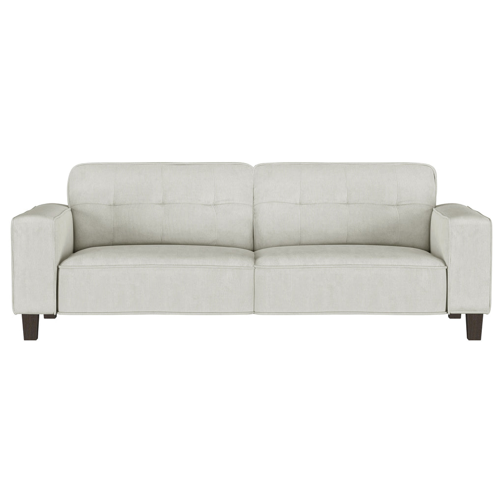 Infuse tailored elegance with the tufted details of a modern sofa set. Featuring a three-seat sofa and two-seat loveseat, this set offers a refined anchor for your living room seating. Smooth, soft upholstery adds neutral color, while plush foam and sinuous springs ensure optimal comfort. The sofa and loveseat each feature tufted back cushions, offering a refined touch of mid-century charm. Track arms define a straight, clean-lined silhouette that's simply timeless and each piece stands on dark brown finished tapered wooden legs that add airy height.