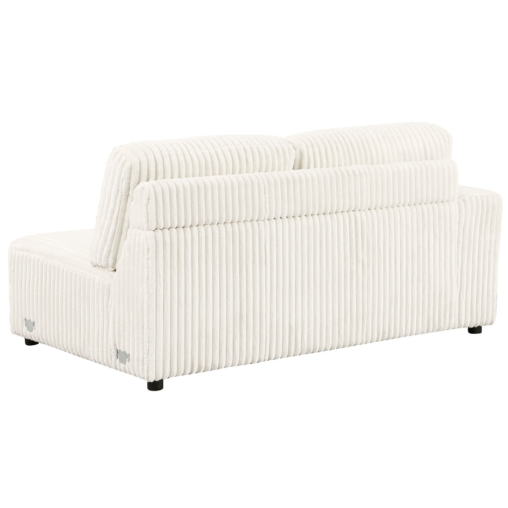 Start your sectional with the LAF loveseat, upholstered in ivory wide corduroy for a plush, fur-like texture. This piece includes two pillows for added comfort and style, making it a perfect addition to your modular setup.