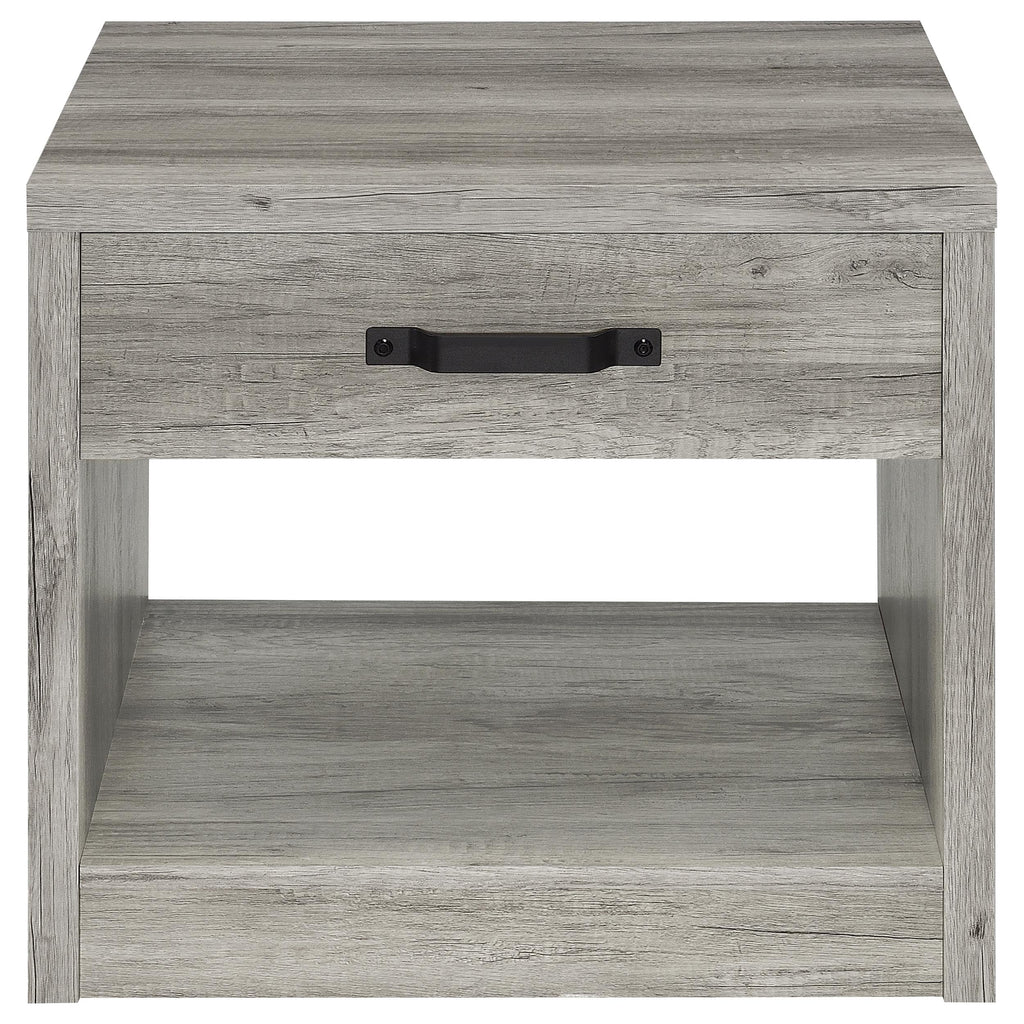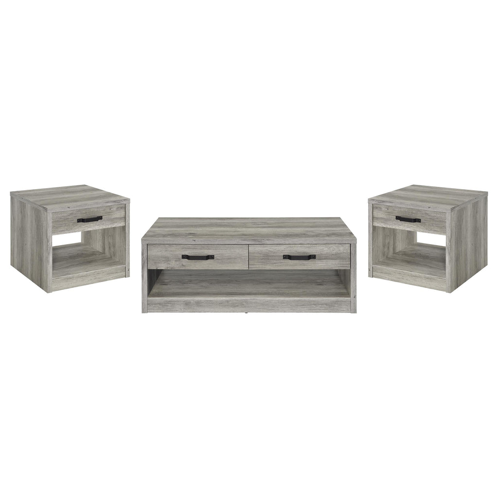 Create a cohesive look in your living space with this rustic coffee table set. Featuring a weathered gray wood-look finish, the set is crafted with engineered wood and scratch-resistant veneer for durability. Each piece includes clean lines, spacious storage drawers with bold black metal handles, and open shelves for additional display or storage. This set blends rustic charm and functionality, making it ideal for casual and modern interiors alike.