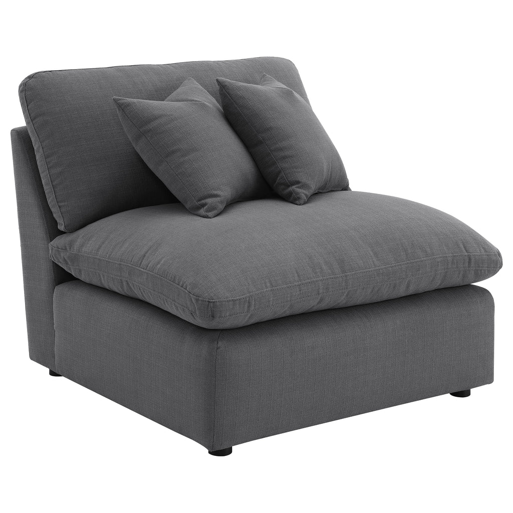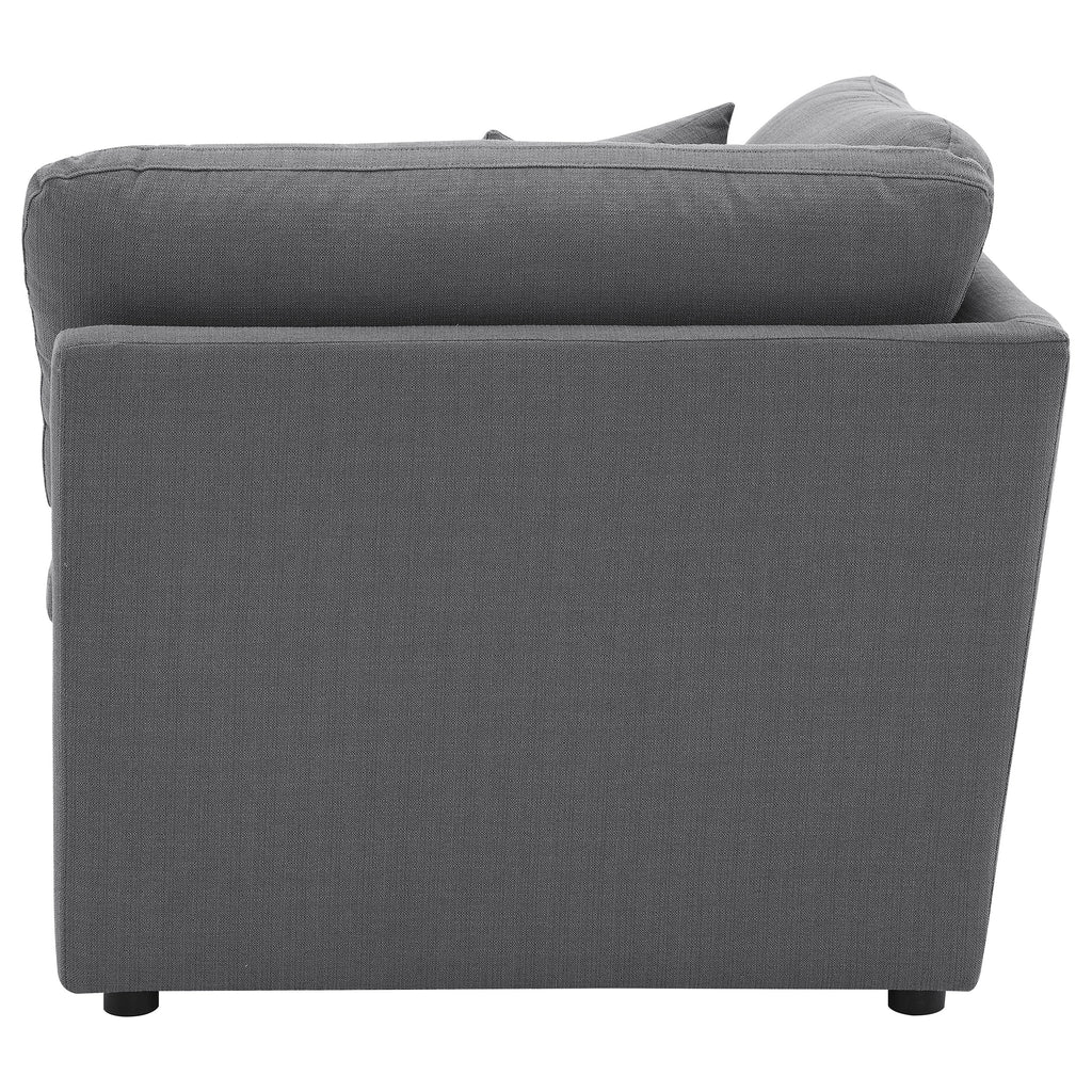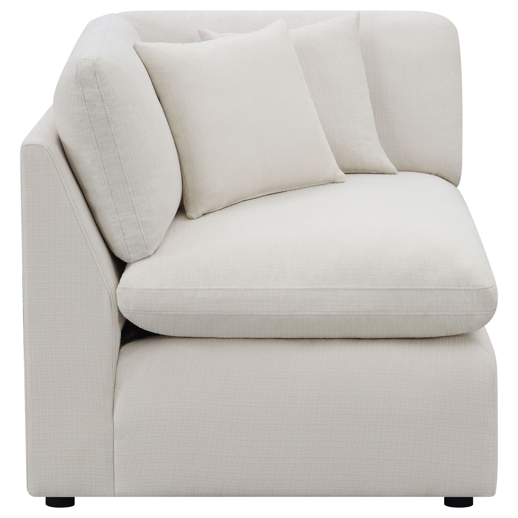Complete your spacious modern living room with this beautifully designed modular sectional, featuring soft, textural fabric. Feather blend-wrapped box cushion seating with reversible cushions and topstitched details, paired with a thin track arm design, create a sleek, modern aesthetic to elevate your family room and beyond. Matching accent pillows and plush back cushions add extra comfort, nestled against the sloped track armrests. This sectional is perfect for complementing your existing decor, welcoming neutral tones, or providing a sophisticated backdrop to vibrant colors.