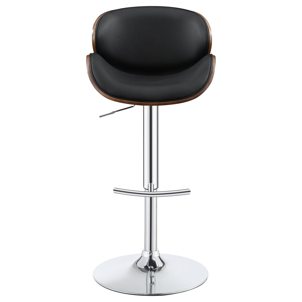 Enjoy glamour and durability with this barstool's distinguished form. For added style, it features a sleek, curved wood seat back finished in rich, warm walnut. The brilliant shine of chrome beautifully balances with the smooth, black leatherette upholstery of its seat. A gas lift offers easy adjustability to help it fit with a variety of table heights. This stool gives an edgy and modern look to any room.