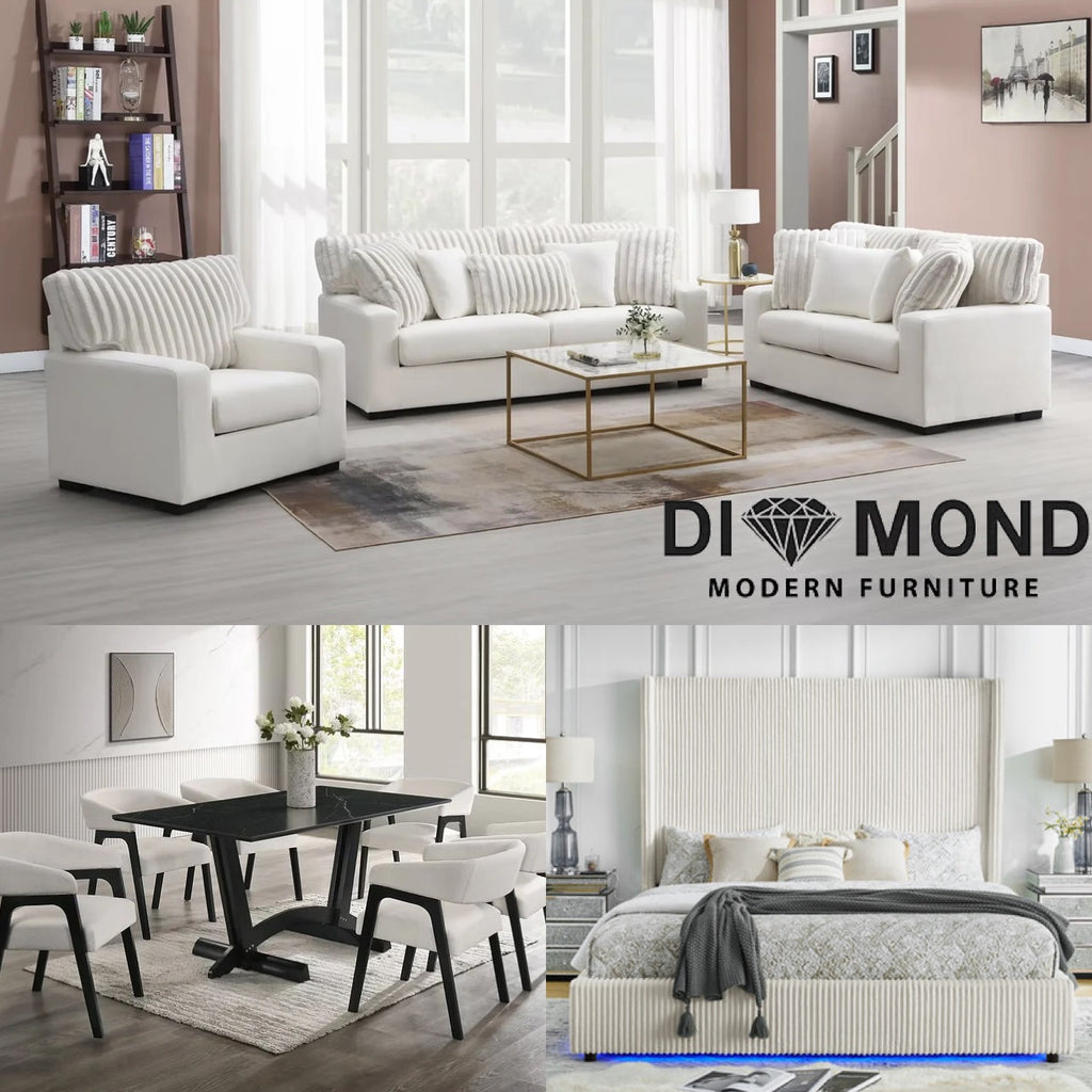 Elegant White 3-Piece Sofa Set, 7-Piece Dining Set & Queen Bed – Complete Home Bundle