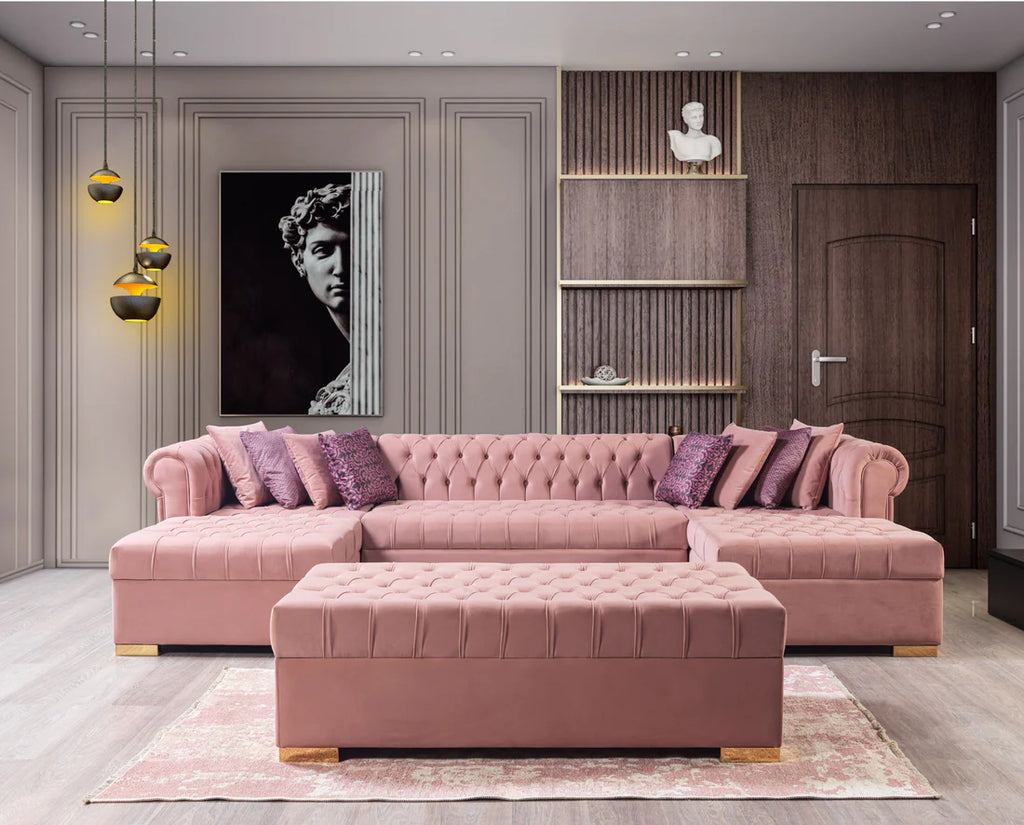Crafted with meticulous attention to detail, the Lauren Sectional represents both timeless elegance and exceptional quality. Its spacious U-shaped double chaise configuration creates a cozy and relax atmosphere, perfect for entertaining or relaxation after a long day. The velvet fabric and tufting of Lauren not only adds a touch of elegance but also helps to maintain the sectional's shape, ensuring lasting comfort and durability. With set of 8 pillows embrace the luxurious softness.