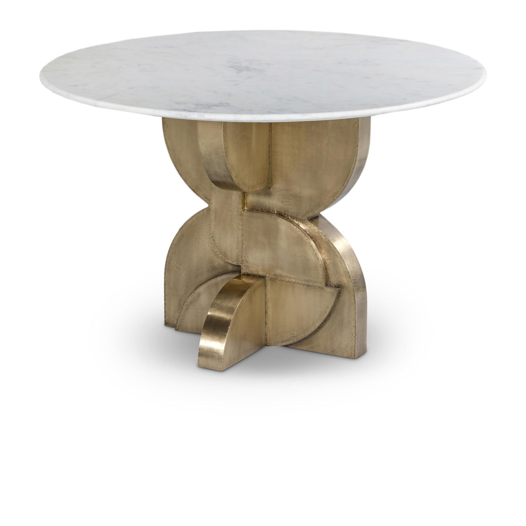 The Alden White Dining Table is an exquisite piece that will effortlessly elevate the interior decor of your dining room. Its genuine marble top exudes luxury, while the brass finish metal sheet base adds a touch of elegance to the overall look. Its stunning and unique design is sure to catch the eye of your guests, leaving them in awe. This remarkable piece is perfect for creating a warm and inviting atmosphere in your home.