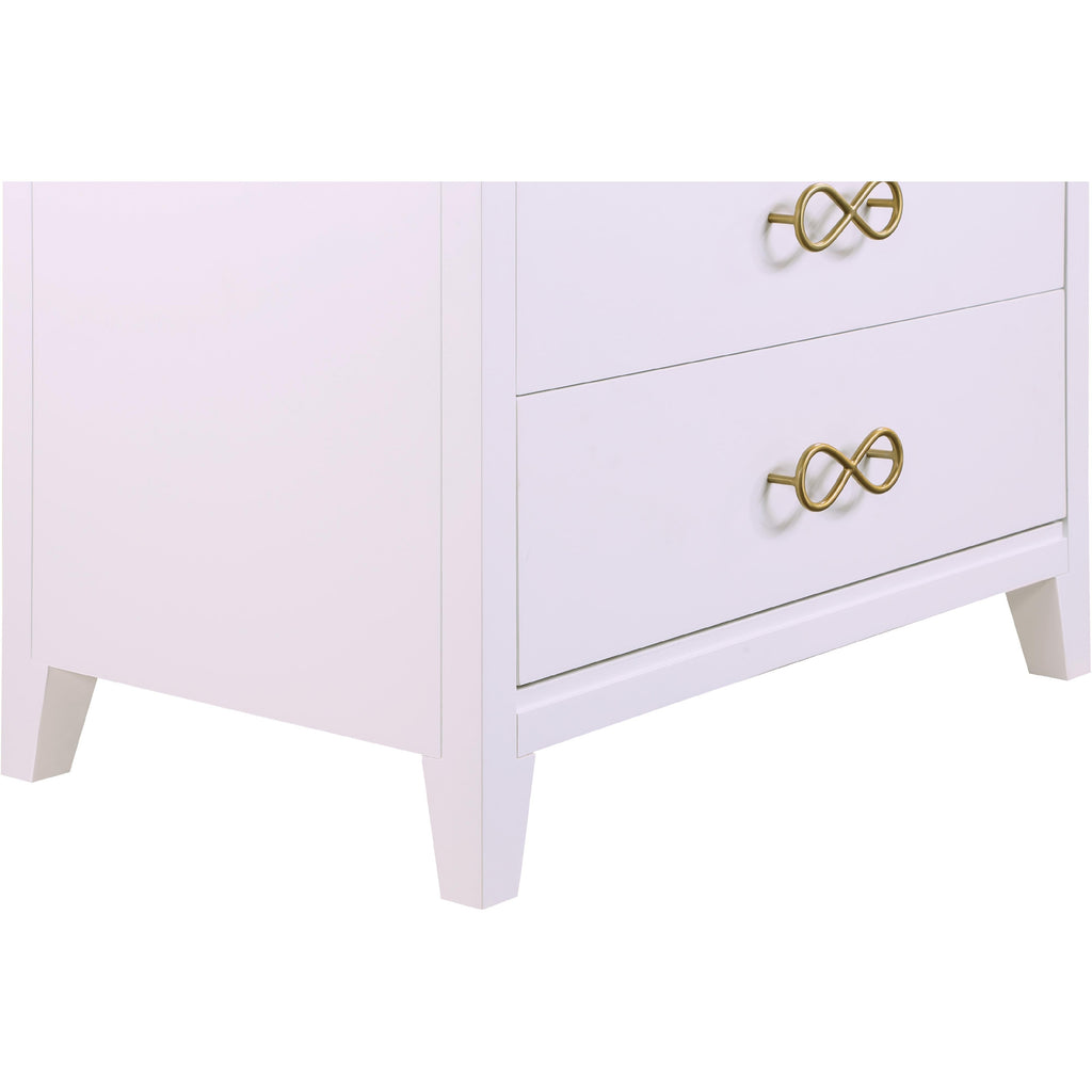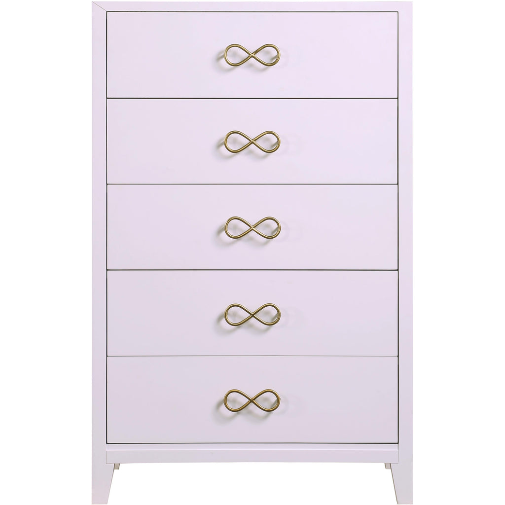 Bring unique elegance to your bedroom with this Bowtie pink/gold chest from Meridian Furniture. This chest features five drawers, providing you with plenty of storage space for clothes, linens, or miscellaneous objects. Its light pink color adds a touch of femininity to your living space, and its brushed gold bow tie handles complement your existing decor. Its flat top is perfect for placing a lamp, framed picture, books, bric-a-brac, and more.