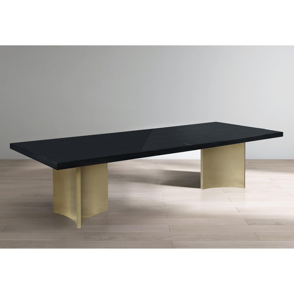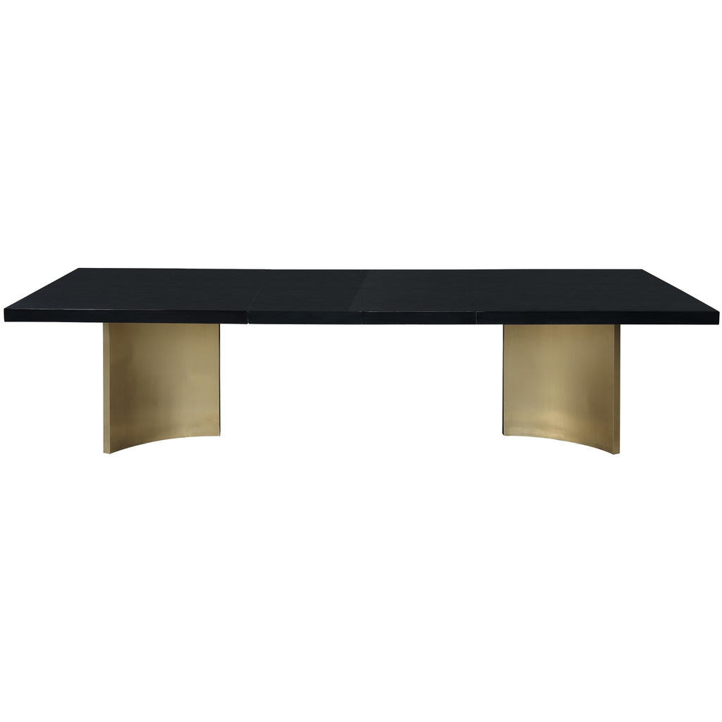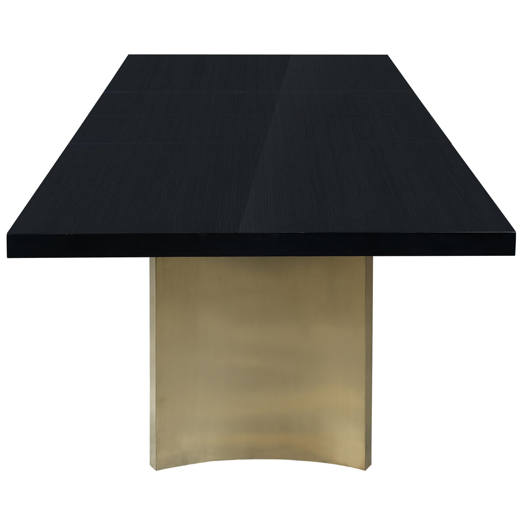 Enjoy oodles of elbow room with this Immerse dining table. Designed to accommodate the whole gang for meals large and small, this pretty table features a rich black lacquer top with wood grain details for an upscale presentation in your dining room space. A steel base supports the amply sized top and features a brushed gold finish for an elegantly eye-catching look.