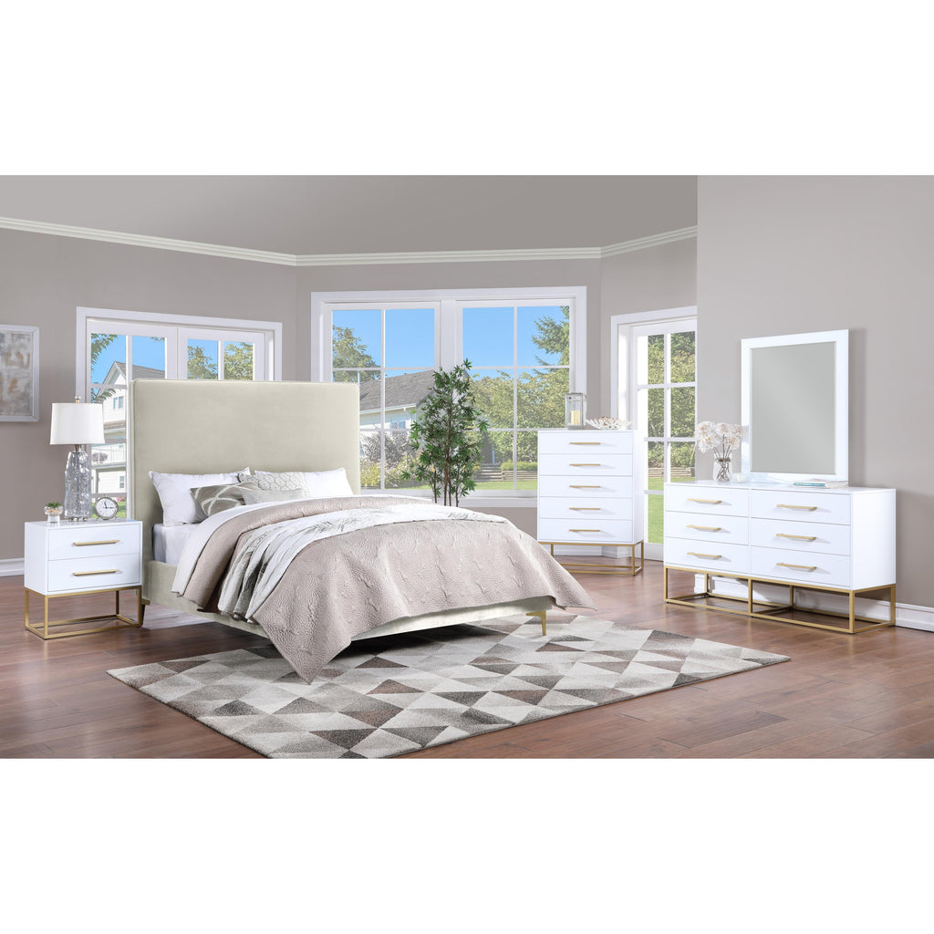 Outfit your space with this Maxine chest, part of the Maxine collection of contemporary bedroom furniture. This lovely chest features a rich white finish over birch veneer construction for durability, strength, and resilience, and it's equipped with brushed gold metal legs and hardware for a simplistic yet elegant finish. Pair this item with other bedroom essentials in the same collection for a beautiful look in your room.