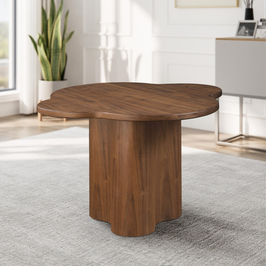 Bring a bold new look to your space with this Mesa Black Dining Table. Crafted with ash veneer and featuring a captivating walnut finish, this table exudes elegance and sophistication. The unique clover-shaped table top is not only visually striking but also adds an intriguing element to your decor. With its bold design and sleek construction, this dining table is a perfect addition to your modern home.