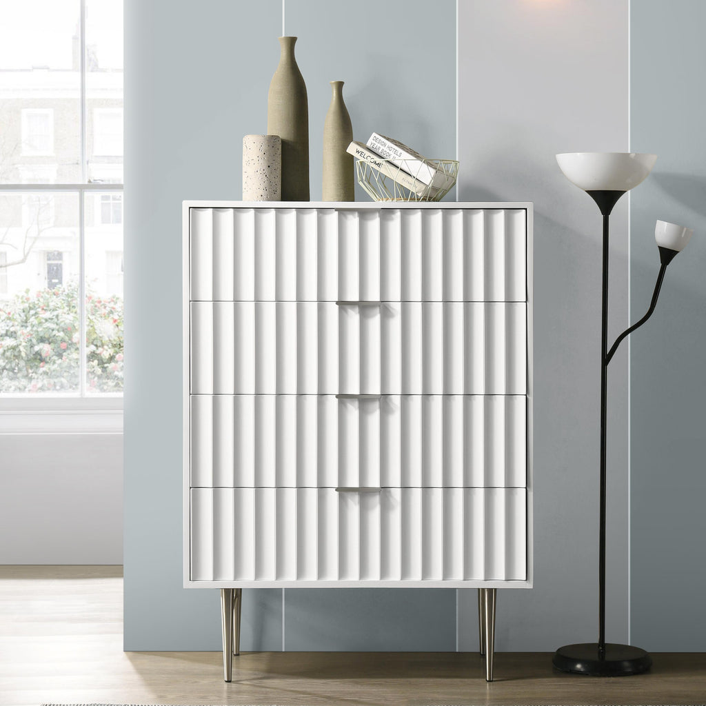 Embody industrialist style with this Modernist chest in a white medium gloss finish. Utilitarian but sculptural in design, this piece features a ridged, textured look that is chic but sleek. It rests on brushed chrome steel legs and has chrome brushed handles for a bit of regality. Combine this piece with other items in the Modernist lineup for a cohesive finish to your room makeover.
