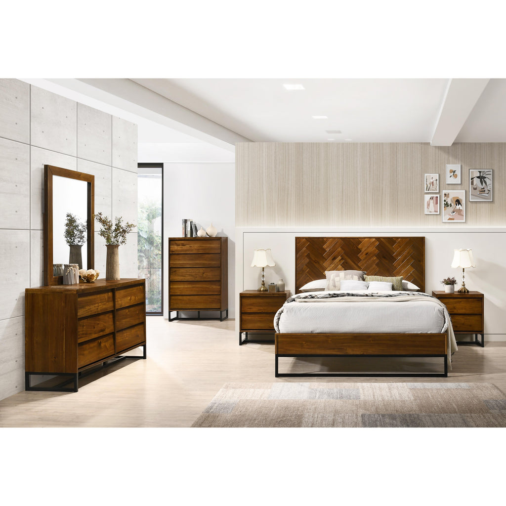 Create a distinctly contemporary vibe in your bedroom sanctuary with this antique coffee Reed chest from the Reed Wood collection. This handsome chest offers lots of room for holding folded apparel, and it rests on a metal base in sleek black matte for a modern touch. The hardware-free drawers lend to the chic, sophisticated and minimalist design of this chest, which features ample room on top for displaying framed photos or keepsakes.