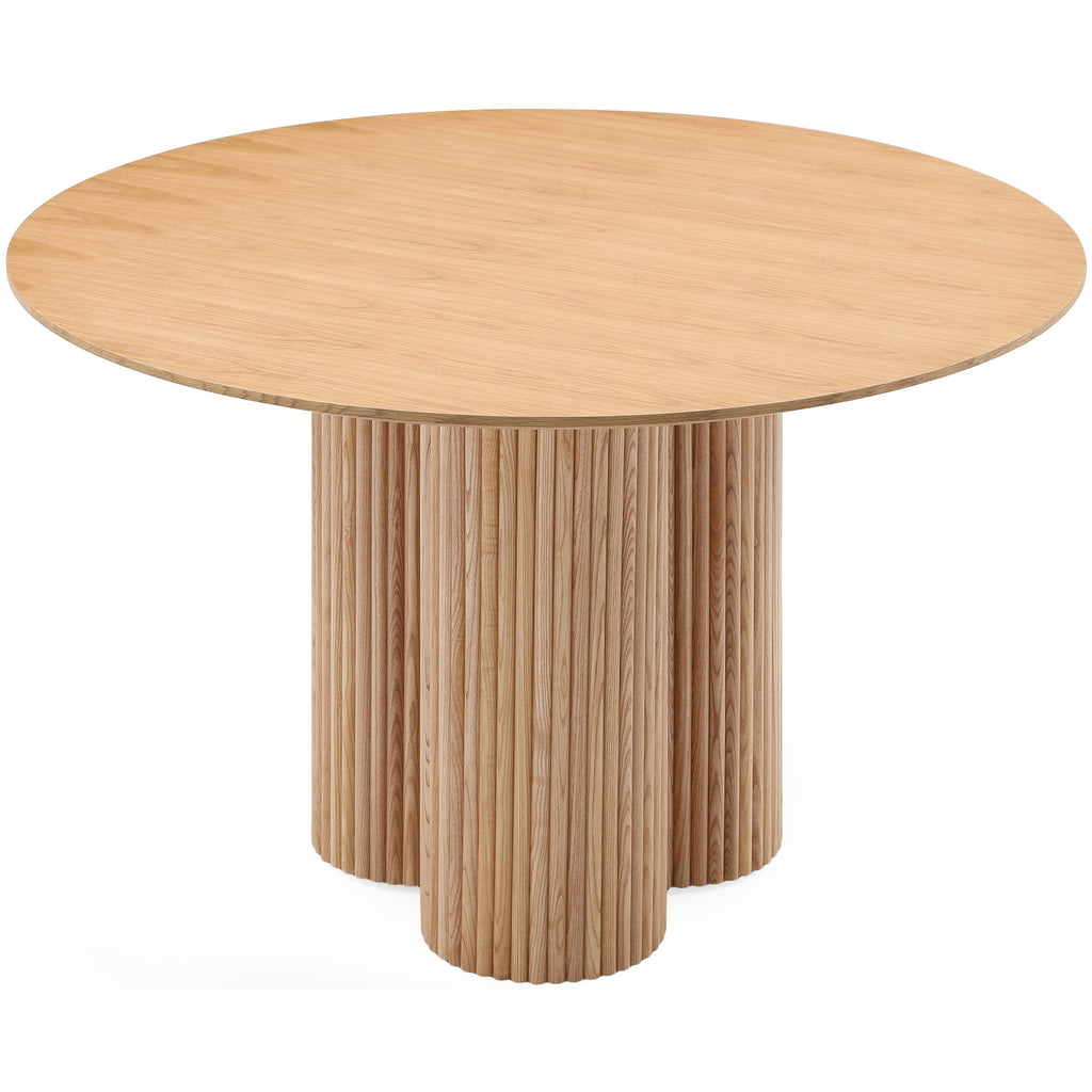 Gather your favorite peeps around this Simba dining table. A sleek shade of white, this handsome mid-century designed table has a modish look that's perfect for both contemporary and traditional dining rooms. The natural oak veneer table top measures 48 inches, giving you oodles of room for place settings and lots of elbowroom for dinner guests. Made from ash wood and wood products, this sturdy table has a solid wood fluted base for added aesthetics.