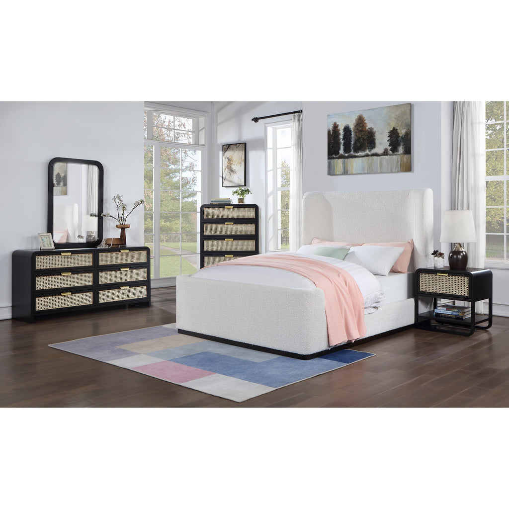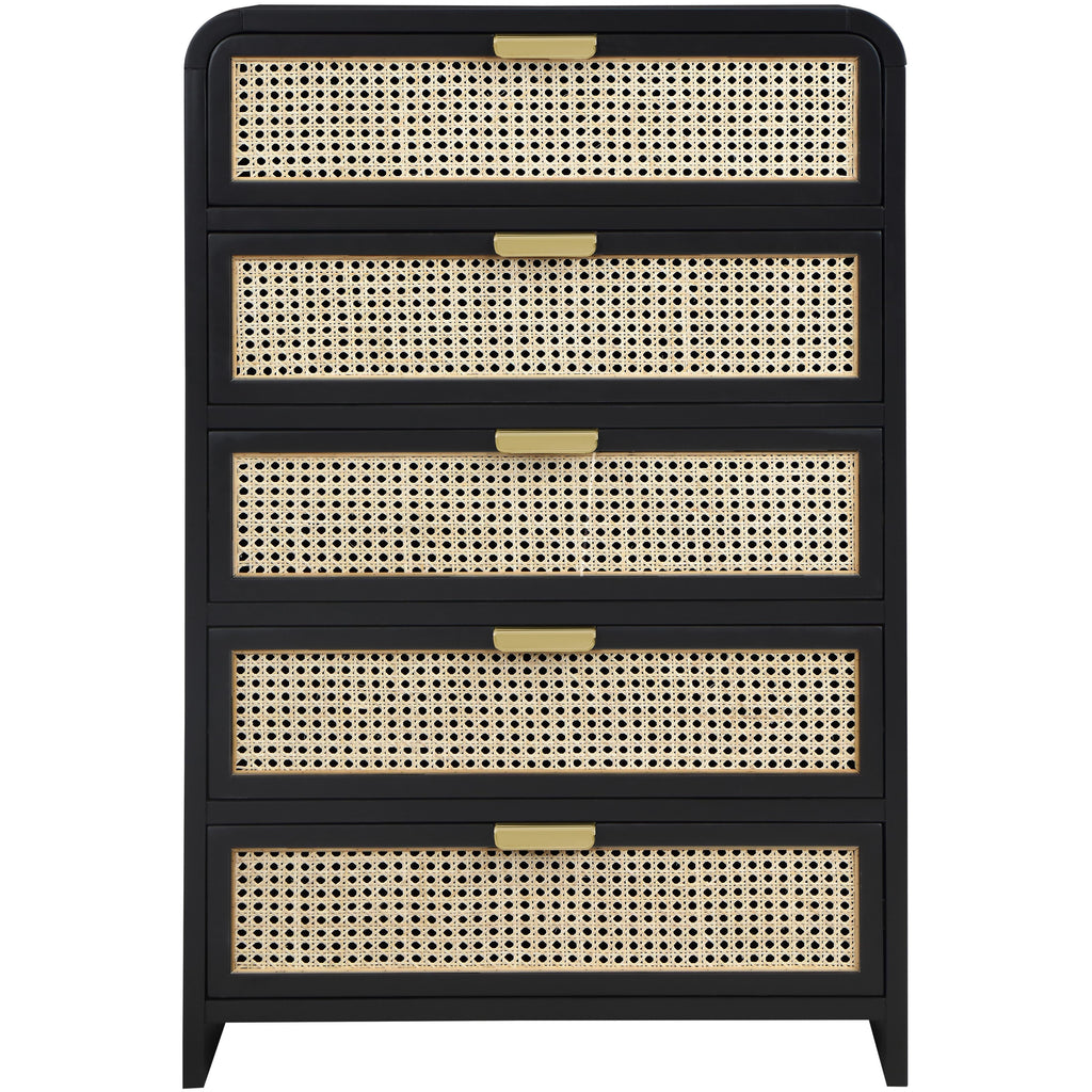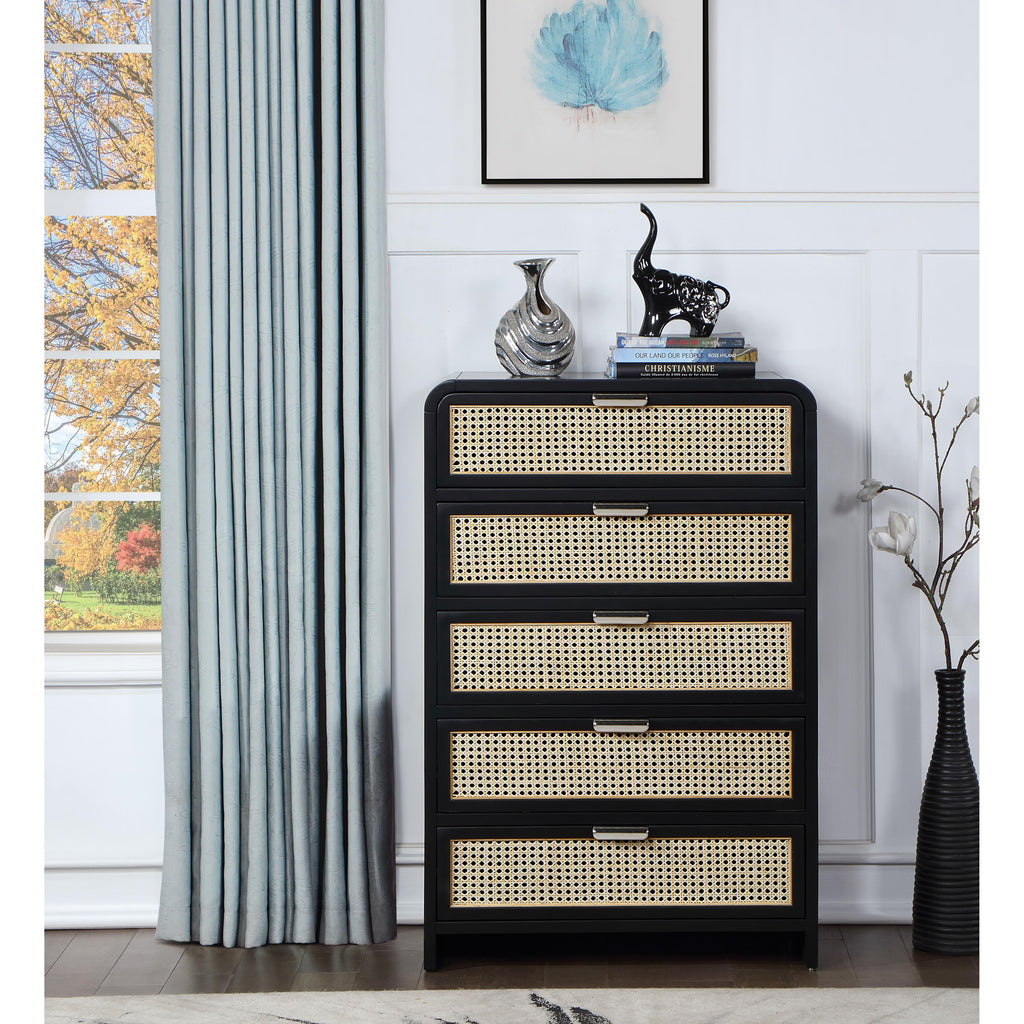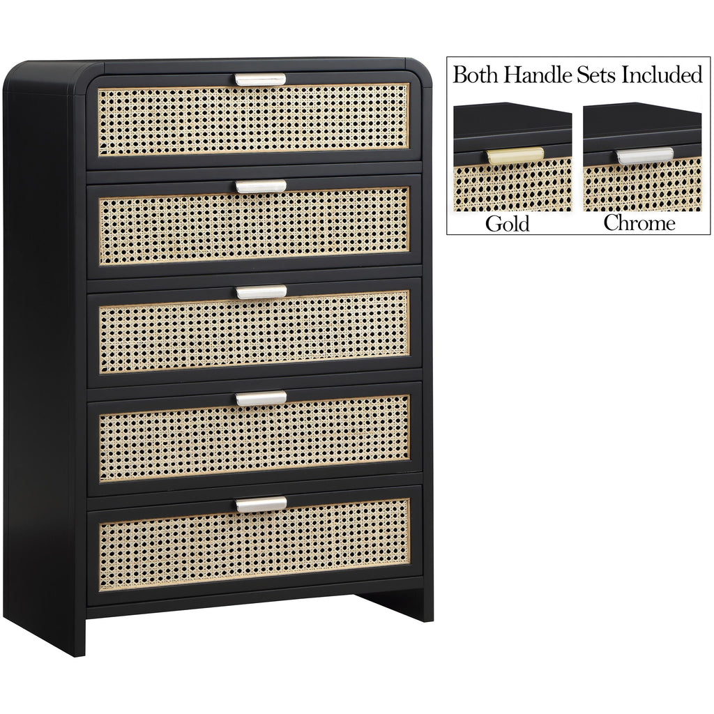 Bold design elements are the hallmark of this Sage wood chest. This beautiful chest features up-to-the-minute styling and a black finish that's perfect for your contemporary room. Natural cane details provide an exciting contrast that adds a robust finish to your bedroom look. Two sets of hardware come with this handsome chest so that you can give it your own unique, personal slant. A rich wood frame ensures lasting beauty and ongoing performance.
