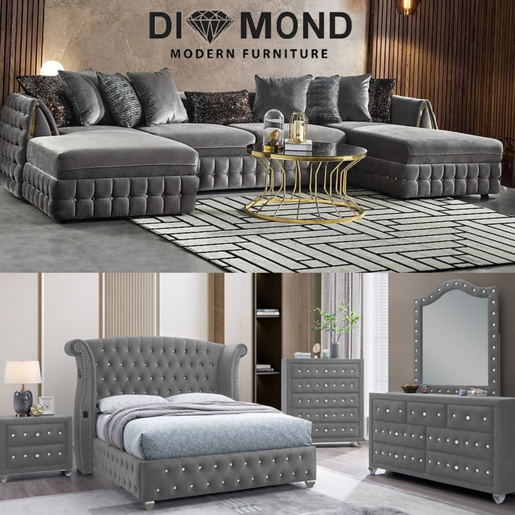 Matching Bedroom Set in Gray Velvet Accents – Designed to complement the sectional, this bedroom set includes a chic bed frame with headboard, featuring elegant gray velvet details for a cohesive and modern look.