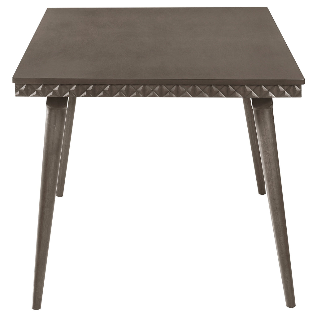 Create an inviting, contemporary dining space with this stylish dining set. Anchored by a sleek, rectangular dining table and complemented by plush side chairs, this set combines comfort with modern aesthetics. The table and chairs feature a sophisticated molded trim, offering a touch of artistic flair, while the chairs add texture and warmth with their plush upholstery. Perfect for family meals or elegant dinners, the set brings a touch of refinement and character to any home.
