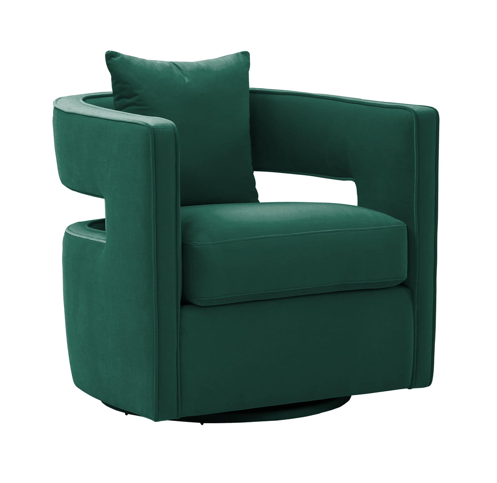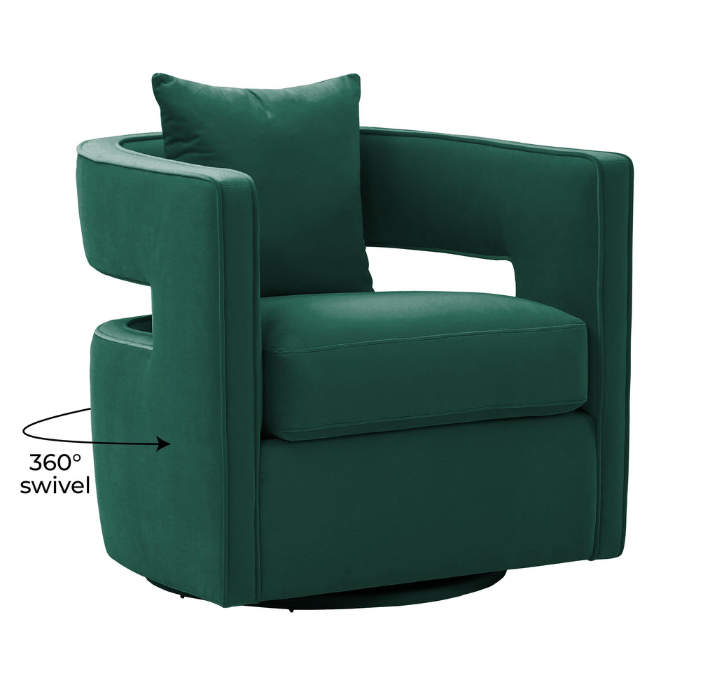 The minimalistic Kennedy swivel chair is versatile and stylish. A comfortable foam fill makes it as plush and inviting as it looks, while the solid wood frame and stainless steel legs set a sturdy foundation. This eye-catching chair will add a pop of style to any space. Sumptuous velvet available in multiple color options.